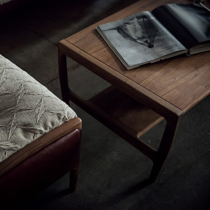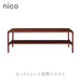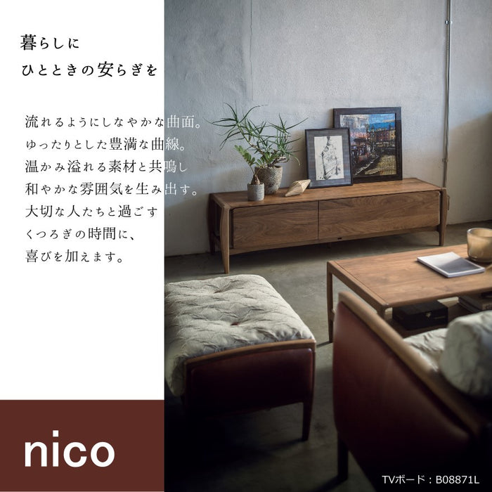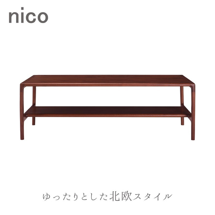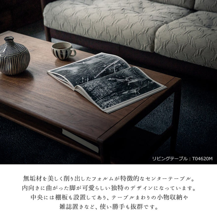 無垢材を美しく削り出したフォルムが特徴的なセンターテーブル。内向きに曲がった脚が可愛らしい独特のデザインになっています。中央には棚板も設置してあり、テーブルまわりの小物収納や雑誌置きなど、使い勝手も抜群です。ニコシリーズのソファやボード類と組合せて、レトロモダンなコーディネートをお楽しみ下さい。
